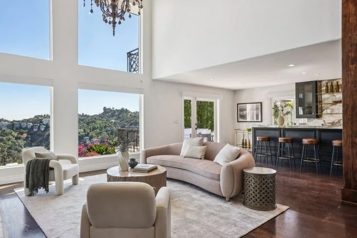 Living room with large windows, white walls, beige sofa, white armchair, round coffee table, area rug, and bar stools at a kitchen counter.