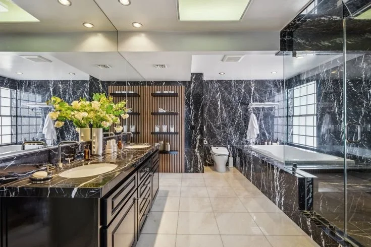 Modern kitchen with a dark blue island, four brown leather stools, a marble countertop, wall-mounted black cabinets with gold shelving, and a marble backsplash. There is a round mirror on the wall and a window with greenery outside.