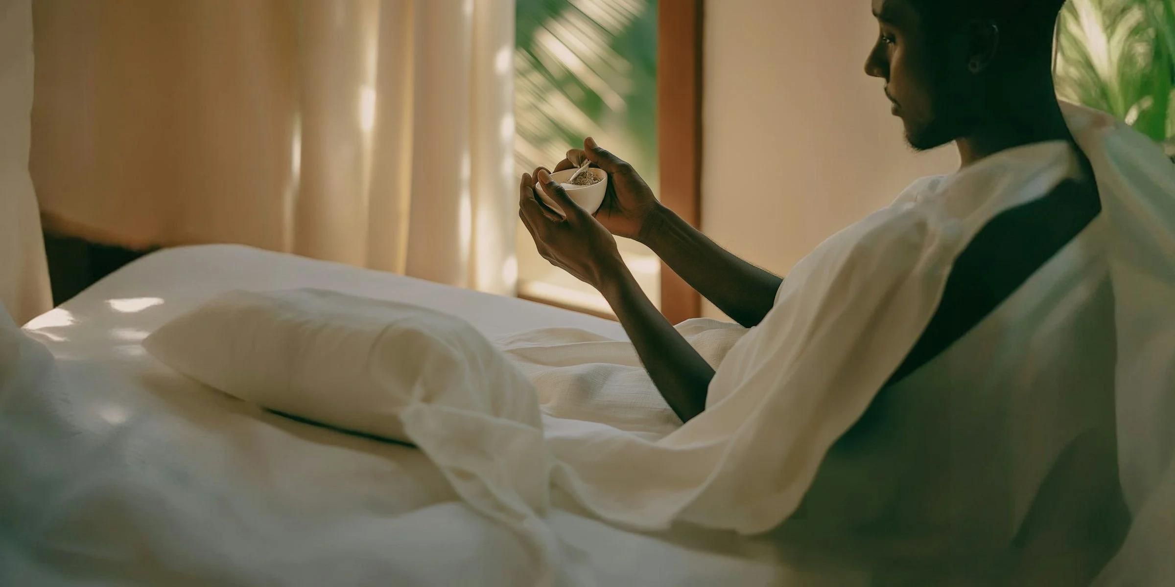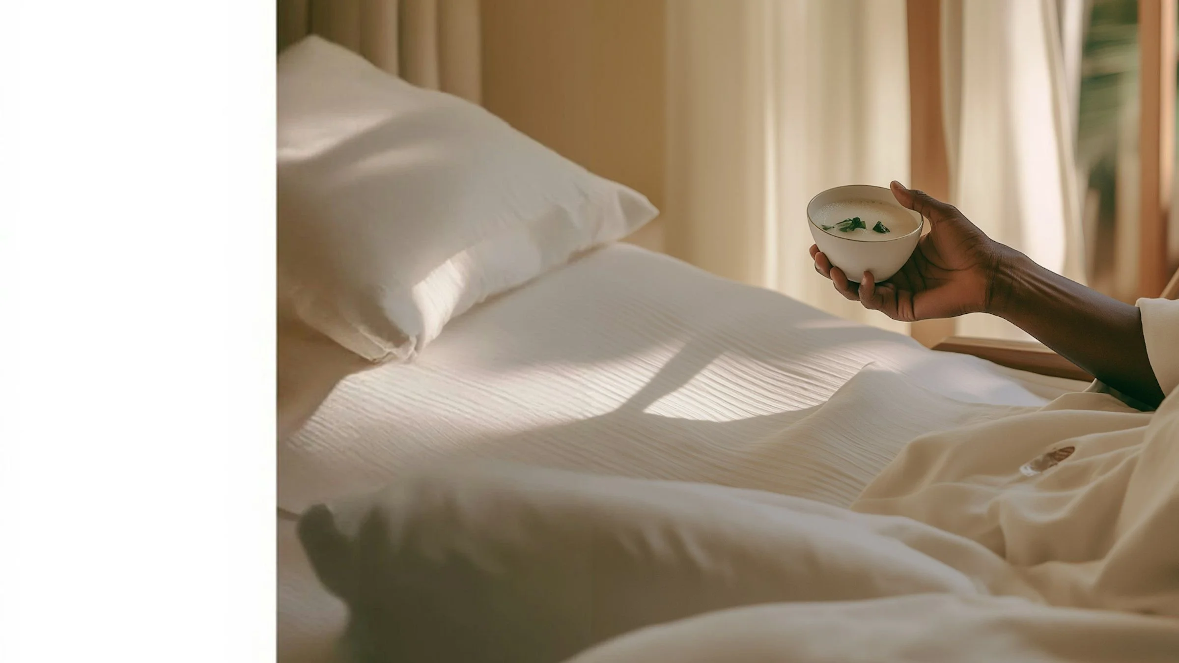 A person with dark skin holding a bowl of soup while sitting on a bed with white linens, in a room with beige curtains.