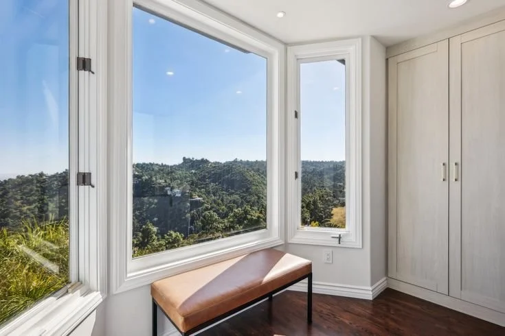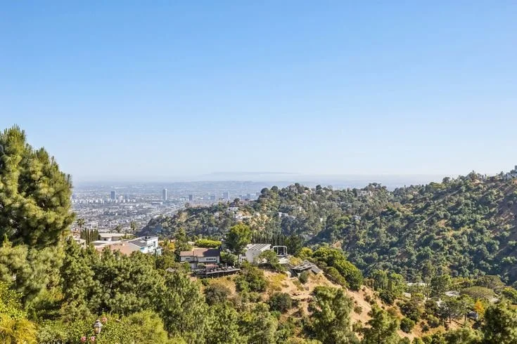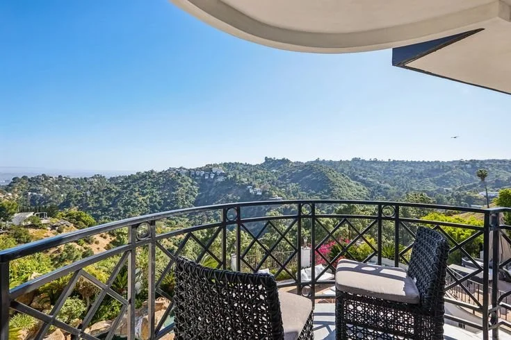 Balcony overlooking a hillside neighborhood with trees, houses, and a distant cityscape under a clear blue sky.