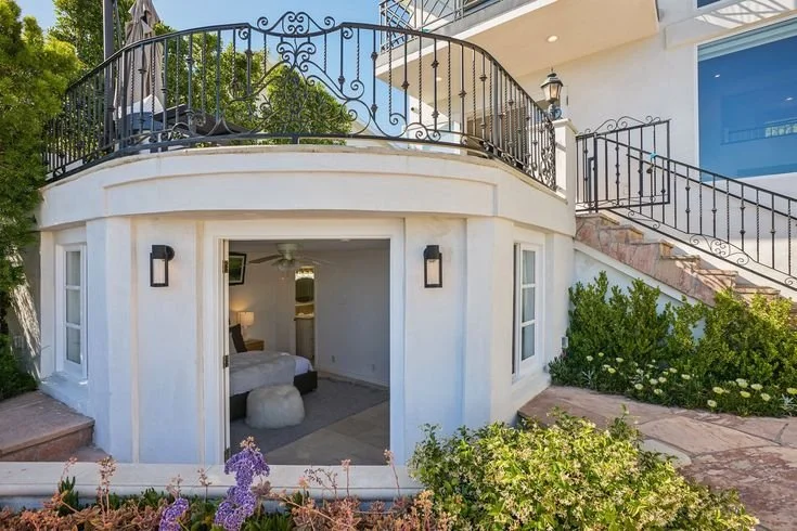 Large modern white house with multiple balconies and large windows, surrounded by lush greenery and palm trees, with a pool and lounge chairs in the backyard.