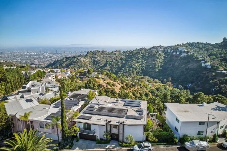 View of a residential neighborhood with modern houses, surrounded by green hills, and a cityscape in the distant background under a clear blue sky.